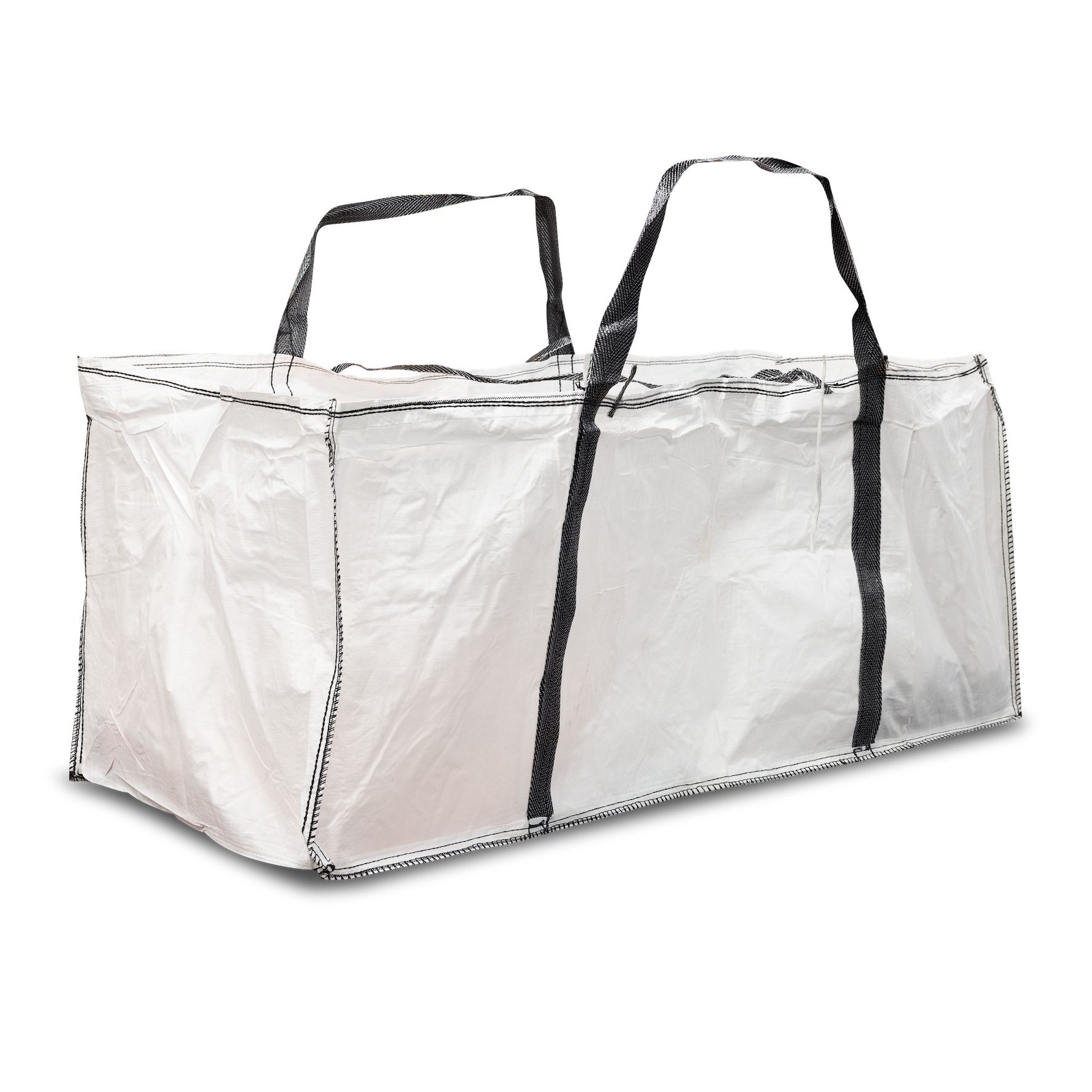 Denne store hvite storsekken er robust og designet for større volumer. Den er laget med hvit pvc-vev, svarte sømmer, og har to løkker for stabilt løft. Sekken har åpen topp. Med en sikkerhetsfaktor på 5:1 og maksimal vektbelastning på 1000 kg, takler den også tunge laster, men egner seg ikke for rene tunge masser. Dimensjoner: 95 cm x 220 cm x 90 cm (interne mål) og rommer ca 1800 liter.
